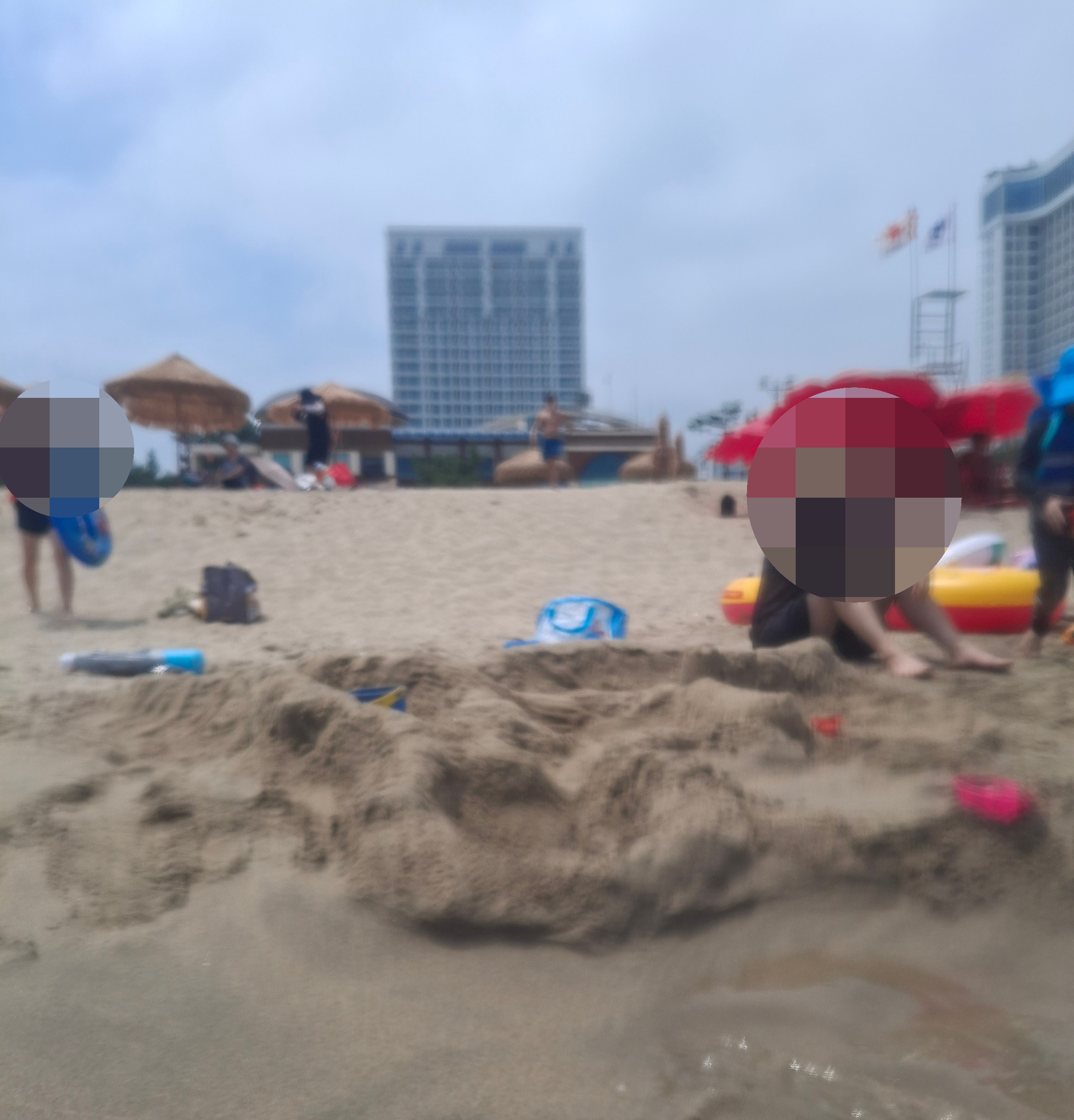 방수팩안에 넣었던 핸드폰 카메라에 습기가 많이 껴서 사진을 많이 못건졌어요. 모래놀이도 실컷하고 ...물이 시원하니 11시 안되서 놀기시작해