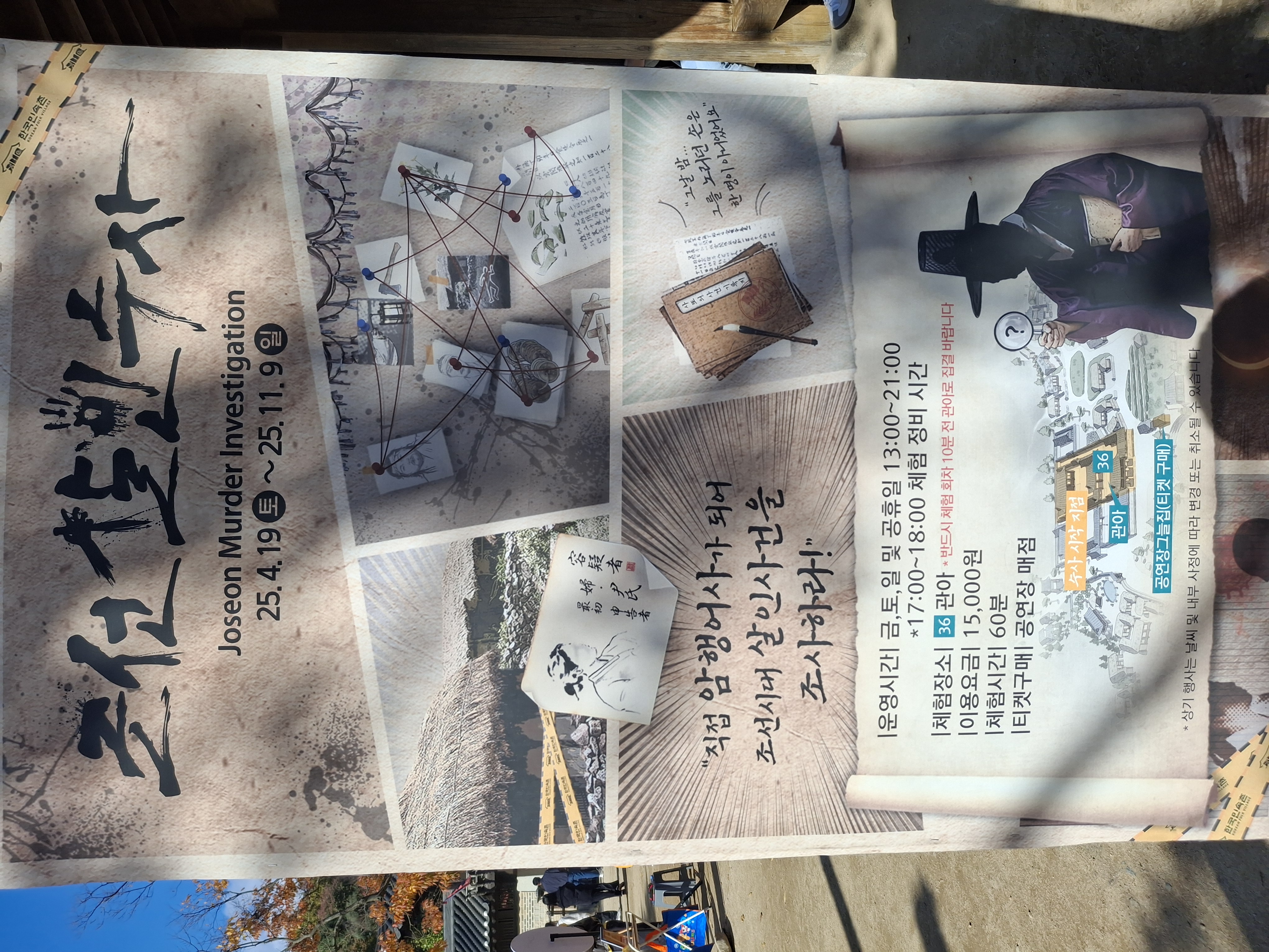 현장에서 예매하려고 오전부터 기웃러렸는데 1시가 되어야 매점에서 표 구매가 가능했어요. 공연장 과 승마장 사이에 있는 매점에서 표구매가능합니다. 민속촌 입장은 15천원에 했는데 이게 15천원이어서 비싼감도 있는데, 진짜 돈 하나도 안아깝고, 참여형 연극같은 기분이었어요. 테가마가 몇가지 있어서 여러번 도전해도 되겠다 싶더라고요. 문제는 생각보다 쉽지않아서 저희시간대엔 맞추신분이 1분도 안나왔어요. 힌트를 주자면 살인도구와 도구가 있었던 위치 그리고 살인자까지 모두 찾아야 한답니다.