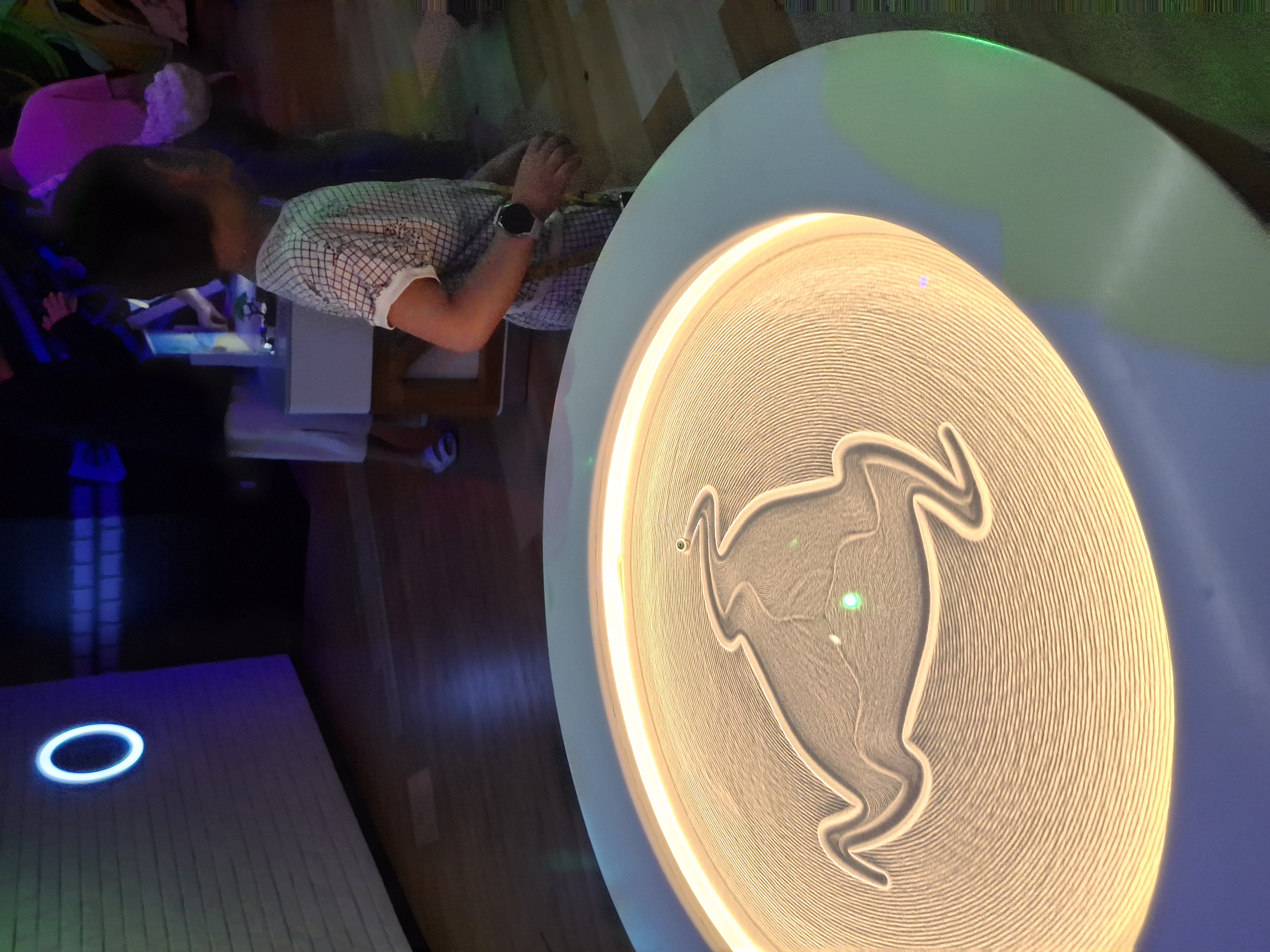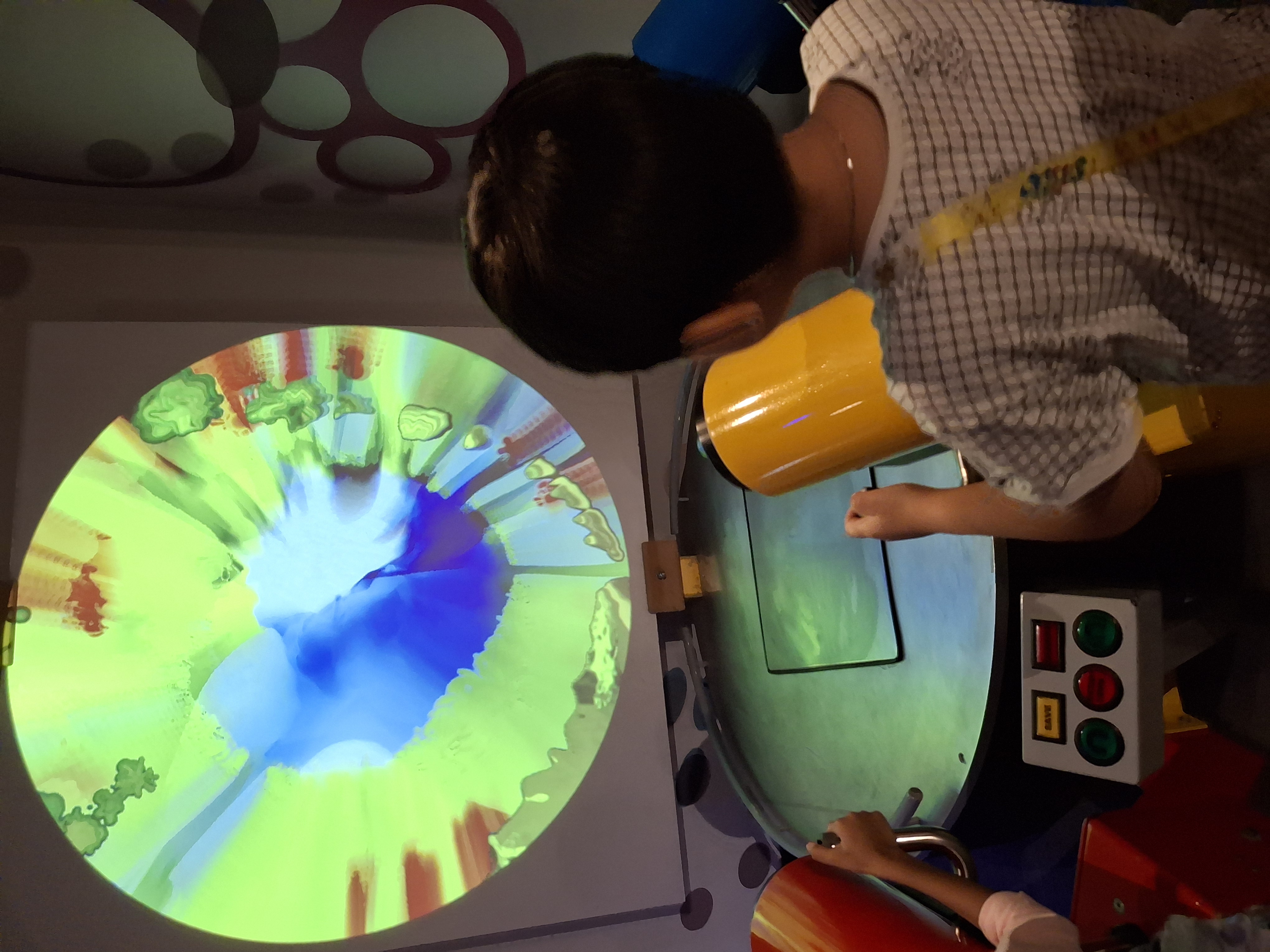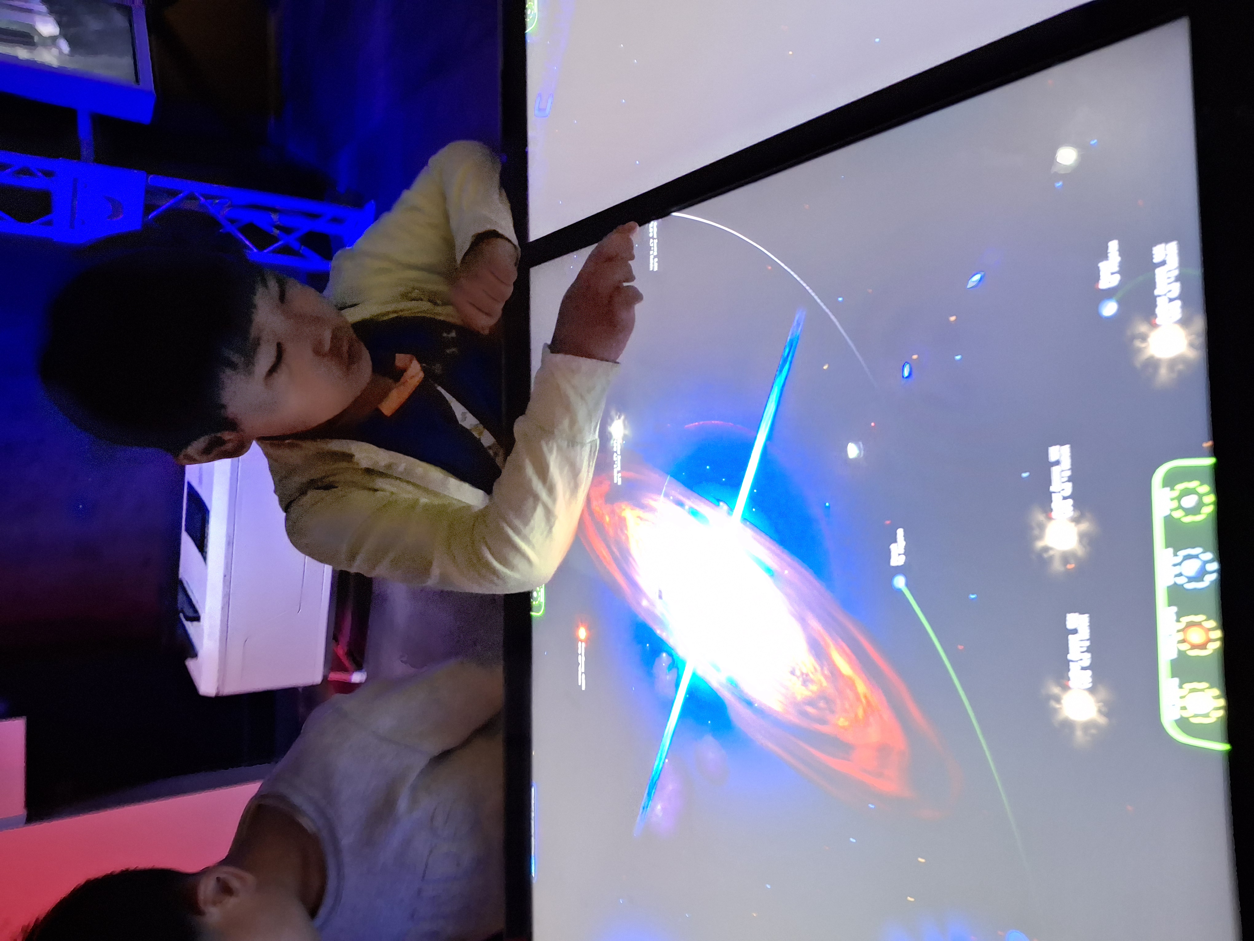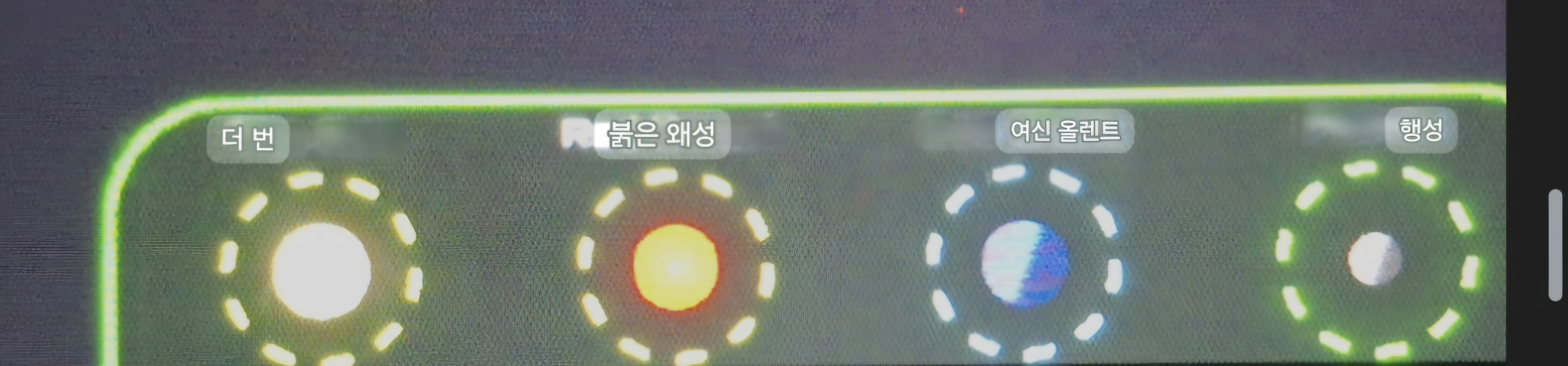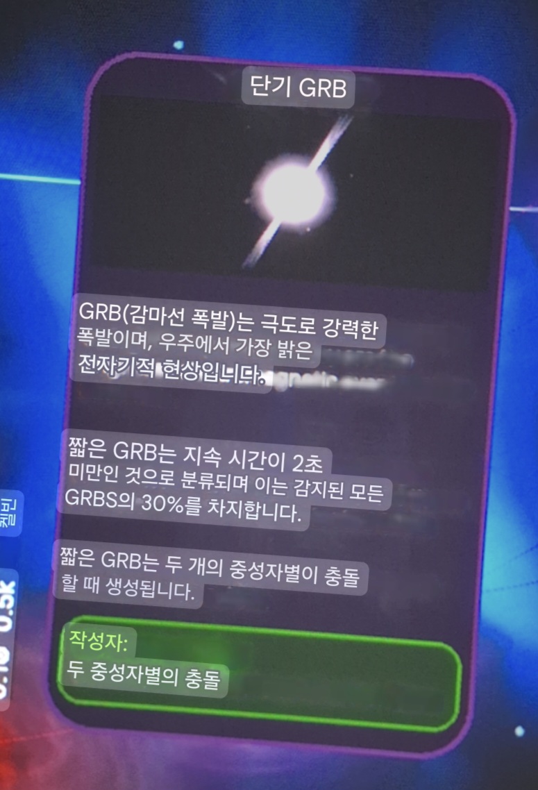 커다란 디스플레이 테이블에 내가 만들수 있는 우주구성물이 4가지가 있어요. 이 중 더번이라고 되어있는 것이 sun 인데 이들이 합쳐지면서 폭팔이 계속 일어나면 블랙홀로 진화되는 과정을 직접 시뮬레이션 할 수 있어요.