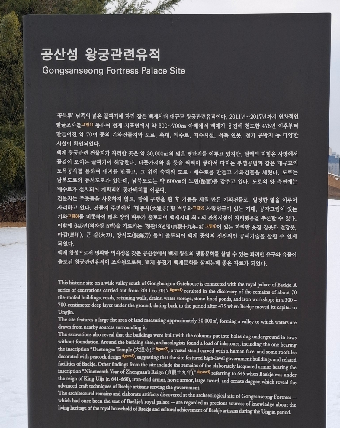 즉 백제 웅진기의 왕성인데, 공산성을 둘러보면 왕궁은 터만 남아있고 그 터에서 나온 유적을 현판으로 안내하고 있어요.