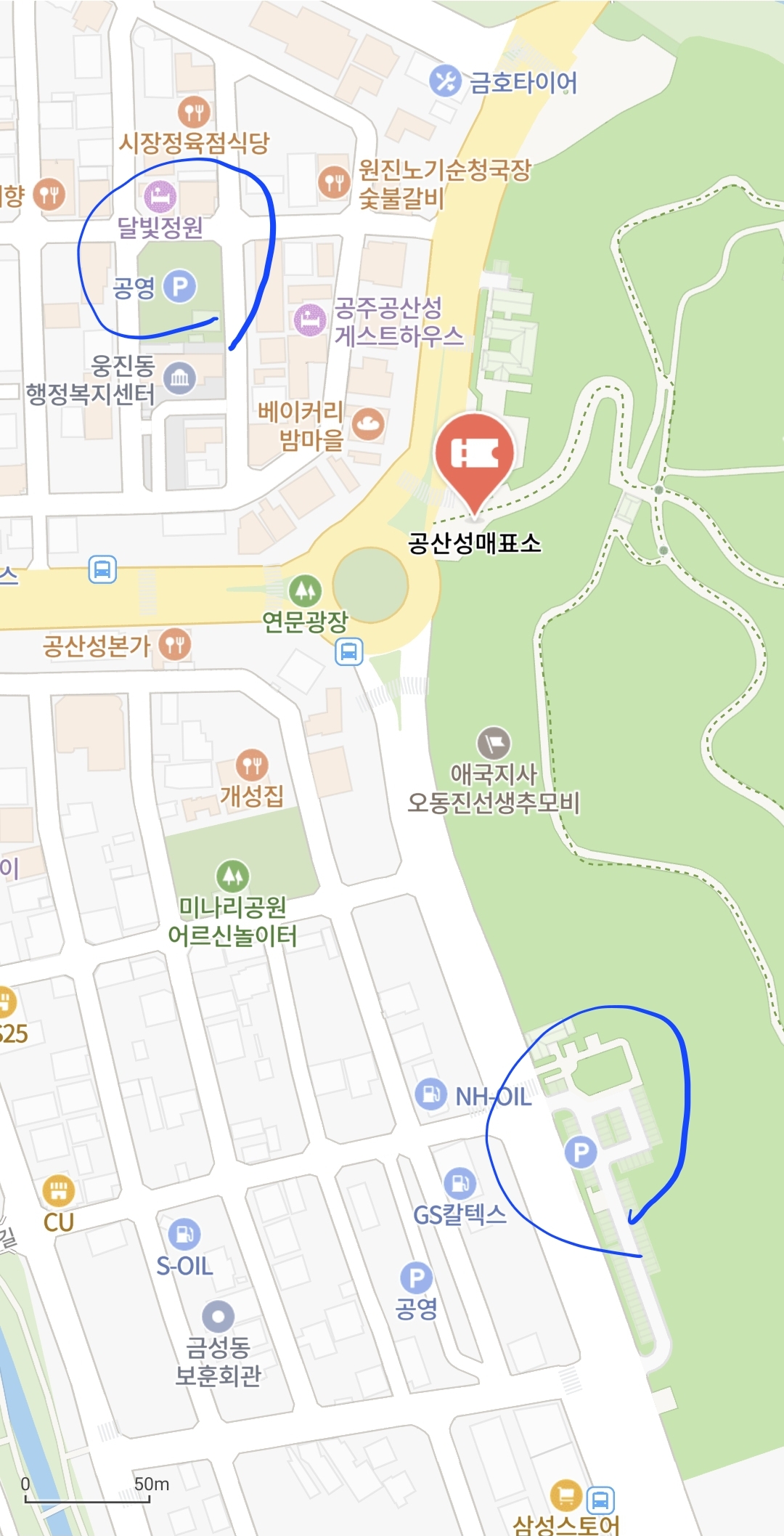 주차장은 공산성 매표소와는 조금 떨어져 있어요. 매표소 앞에 문화유산여권스탬프가 있어서 여기에 스탬프를 찍으실 분은 행정복지센터 옆 주차장도 좋은 선택입니다. 단 자리가 많진 않아요. 저희도 운좋게 나가시는 분 자리에 주차했습니다.