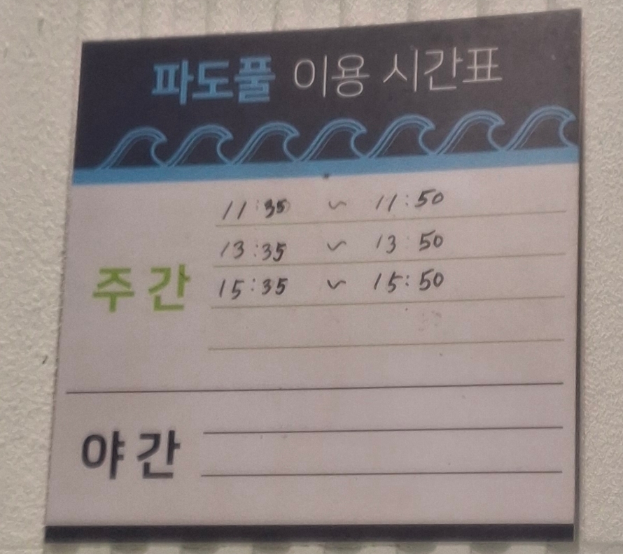 파도풀: 하루 3회(11:35, 13:35, 15:35 등) 운영, 약 15분간 지속