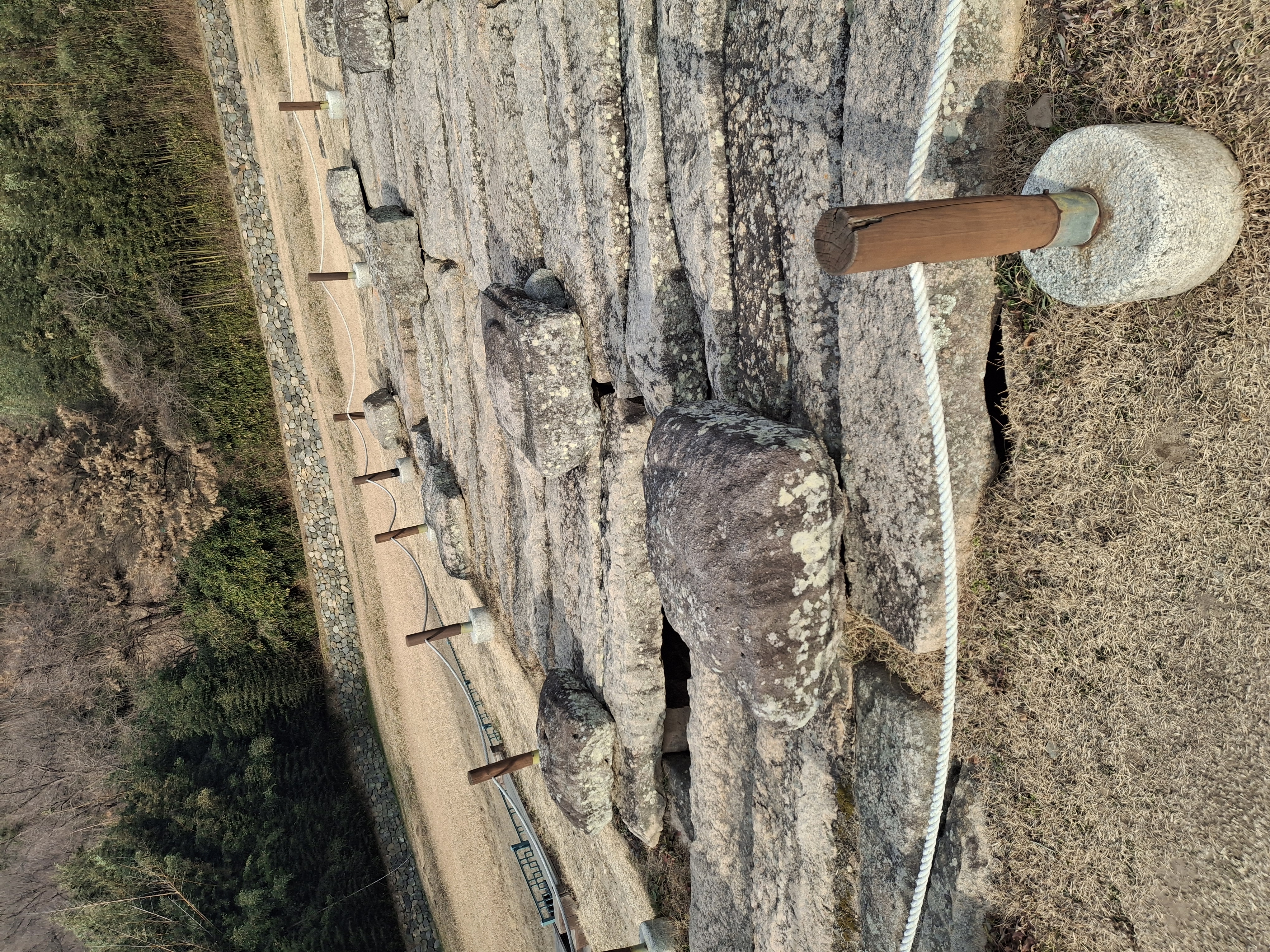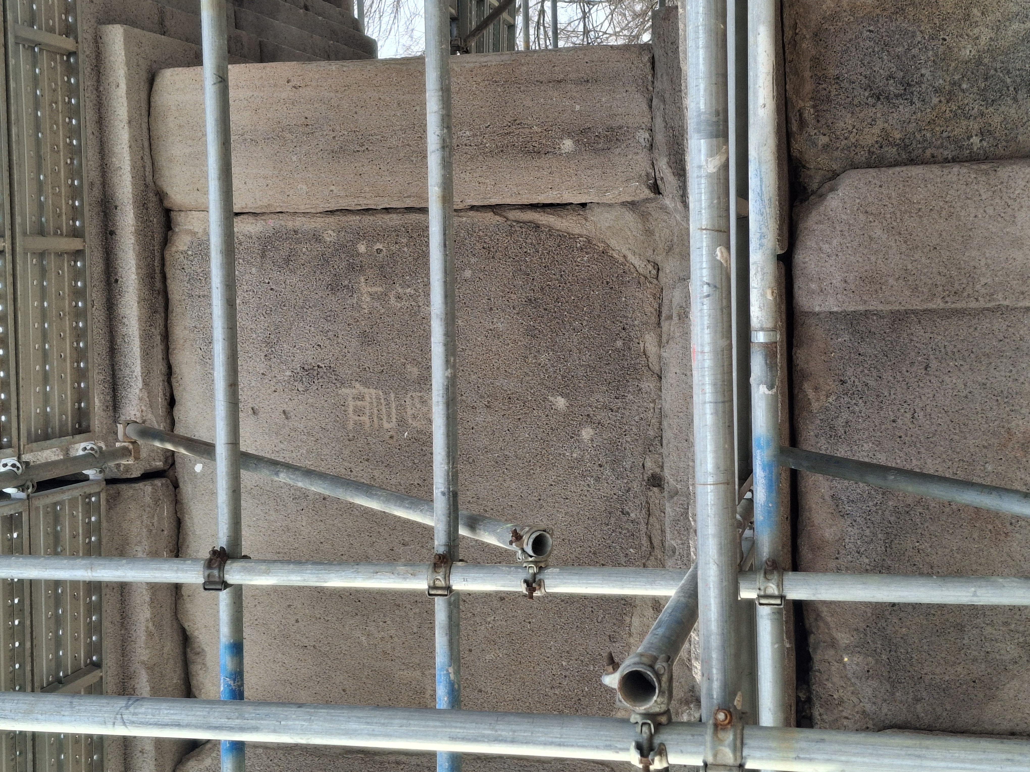 그러나 안타깝게도 석탑 중 하나는 갈라져서 보수를 위해 지지대를 해둔 상태였고 심지어 누군가가 낙서를 한 흔적도 있었어요.