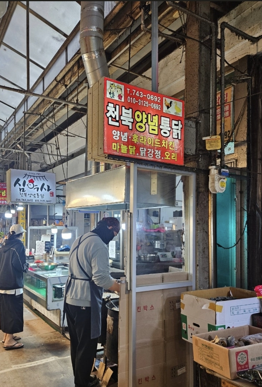3. 천북양념통닭 여기는 현지인분들도 줄 서서 사 가시는 맛집이에요. 양이 정말 푸짐해서 숙소에 포장해 가서 저녁에 시원한 맥주 한 잔이랑 같이 먹었더니 여행 피로가 싹 가시는 기분이었답니다. 처음엔 후라이드한마리 25천원이라고 해서 한마리가 시장치고 비싸내! 했는데 왠걸 많아요. 양이!!! ㅋㅋㅋㅋㅋㅋ 바로 먹지 않고 1~2시간 후에 먹을 계획이라 좀 있다가 먹을 건데 괜찮을까요? 사장님?하고 여쭈었더니 사장님이 콧웃음치시며, 잡쉬봐요. 하시더라고요. 사실 아침 먹은지 얼마 안되었는데 동선때문에 미리 산건데 차에 들고 들어와 맛있는 냄새에 한상자 뜯어서 셋이서 너무 잘 먹었어요. 진짜 바삭바삭 최고입니다. 아직도 생각날 정도에요.