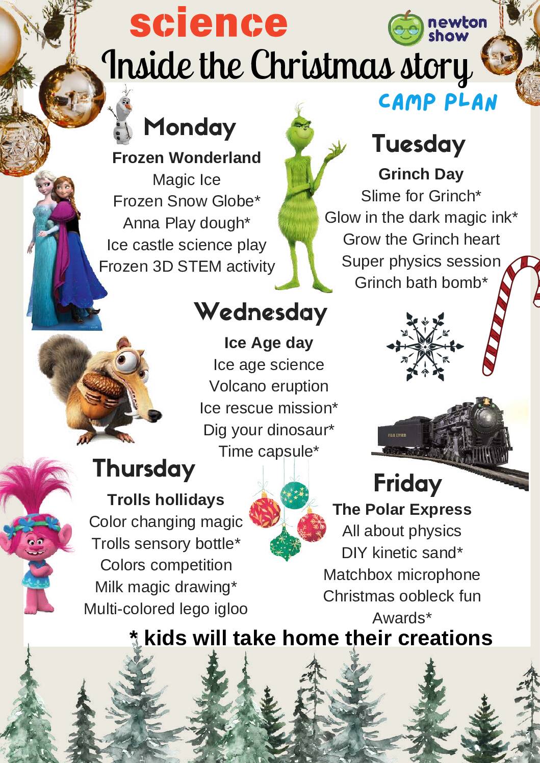 제가 확인했을 때는 크리스마스 캠프로 크리스마스주제의 과학실험과 해리포터캠프로 나누어져 있었고 각각 1주일 코스였어요. 둘 다 하게 되면 2주를 가게 되는 것이고 한 코스만 선택하면 일주일이죠?