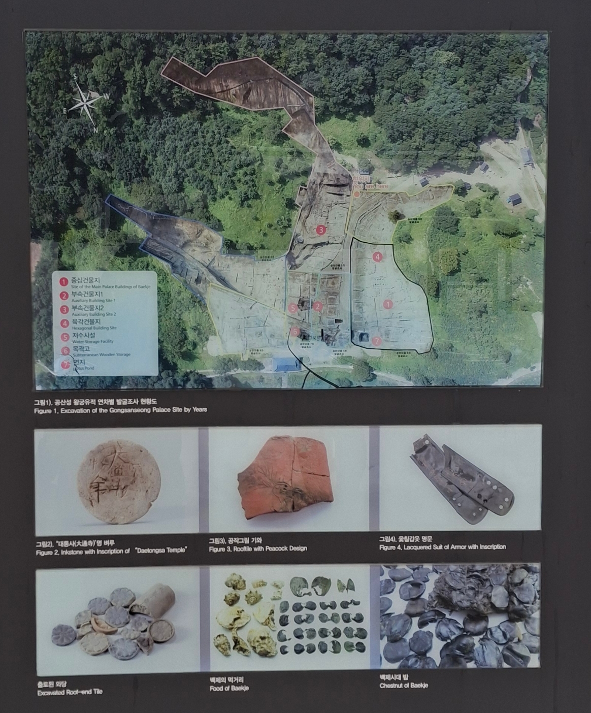 즉 백제 웅진기의 왕성인데, 공산성을 둘러보면 왕궁은 터만 남아있고 그 터에서 나온 유적을 현판으로 안내하고 있어요.
